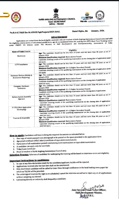 Organization: Karbi Anglong Autonomous Council (KAAC) is conducting this program to provide skill training and employment opportunities.
